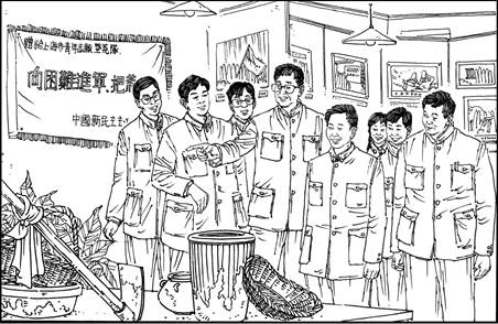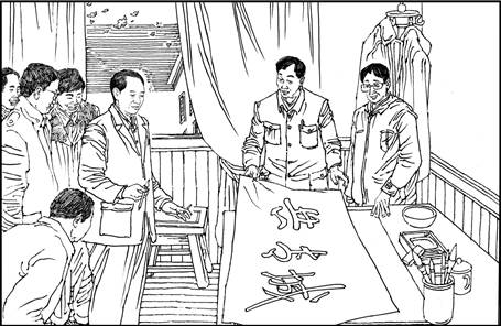 队员们都说好,纷纷要求父亲为他们题名。一个女队员从厨房拿来一根筷子,在筷子头上劈了个口子夹上药棉。父亲接过这支“笔”,写下了“共青社”几个大字。