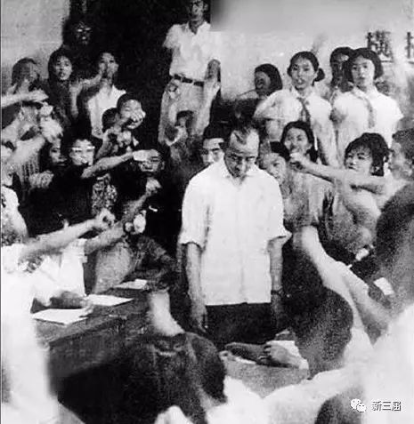 1966年6月,清华附中学生批斗副教导主任冯玉中。部分同学还戴着红领巾