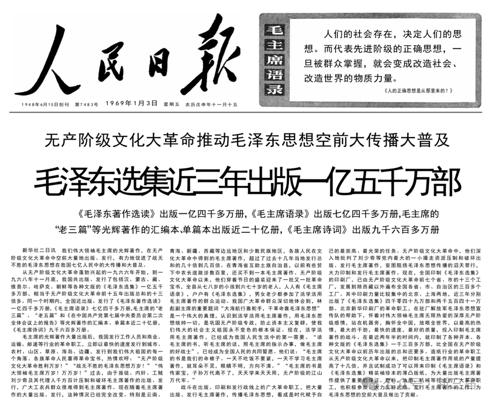196913日的《人民日报》1版头条是关于毛泽东著作出版发行的消息,文中写明《毛主席语录》印行7.4亿多册